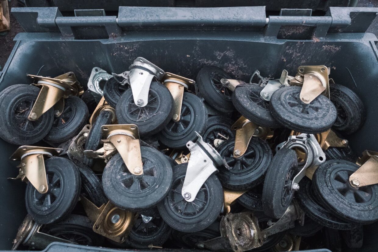 Det eksterne montagefirma adskilte beholderne til mindre bestanddele, fx sorteredes hjulene og dækkene hver for sig.